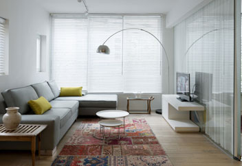 הדירה ממוקמת בקומת פרטר בבניין משנות ה-50 באחת מסמטאות הצפון הישן בת"א. הדירה בעלת מבנה מלבני ושטחה כ-65 מ"ר. כמו כן, נהנית הדירה מ-3 כיווני אוויר ומשופעת בחלונות מכל צידיה. בקצה הדירה ויטרינה הנמתחת לכל רוחב הדירה ומשקיפה לחצר ירוקה. בקשת הלקוחה המתגוררת בדירה לבדה, היא כי הבית יתוכנן ללא חלוקות מודגשות וכי היא רוצה להנות מחלל פתוח וזורם. כמעין "לופט" אורבני. הפתרון העיצובי שנבחר היה למתוח קו מדלת הכניסה ועד לקצה הדירה באורך של כ-10 מטרים. קו זה מפריד בין החלל הפרטי לציבורי ומאפשר על ידי הסטת הווילון "לצרף" את החדרים שמעבר לתחושת החלל הציבורי ובכך להגדיל אותו בשעת הצורך. אקט זה הכתיב למעשה את הטיפול בדירה כולה כאשר בקדמת הדירה נוצרו מבואה וחלל מטבח ובהמשך המבט- הסלון. פינת העבודה מוקמה יחד עם חדר הנכדים בקצה הדירה ובסמוך לסלון כך שיתחברו לפעילות הנעשית בו עם פתיחת הווילון. עבודת הסטיילינג כללה שילוב פריטים שאספה הלקוחה במרוצת השנים יחד עם אלמנטים מודרניים שיוצרו, נקנו ועוצבו במיוחד עבור הדירה .