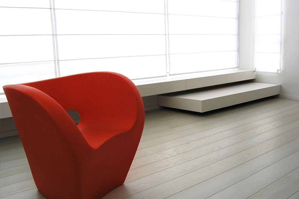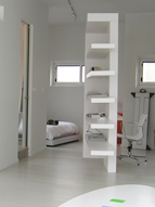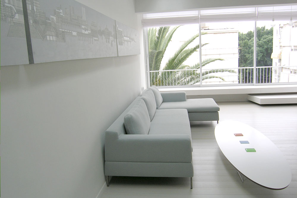 תנאי הפתיחה: דירת 3 חדרים הממוקמת בקומה שלישית ואחרונה בבניין תל אביבי טיפוסי בן 3 קומות. שטח הדירה: כ-75 מ"ר, המצב הקיים כלל ריבוי קירות ומעברים במצב מוזנח ולא שמיש למגורים.בתכנון הדירה התייחסות למרחב הביתי החדש כמרחב בו אין צורך ממשי בהפרדה בין חלל פרטי לציבורי, הניסיון למציאת המכנה המשותף בין כל הפעילויות הוביל לחלל מופשט, ניטרליות לבנה המנתקת את הדירה מהסביבה התל אביבית. על מנת להדגיש את הניתוק, נבחר מסגור נקודתי דווקא של הסביבה הלא עירונית: שמיים ועץ. ארובות אור בתקרת החלל העיקרי של הדירה פותחות פתח לשמיים,וטקסט המודפס על הזכוכית מוקרן לתוך החלל ומשתנה לאורך שעות היום. בלב הדירה מעבר רחב ובו ספרייה המתפקדת כתחנת עבודה ומייצרת פעילות דו כיוונית סביבה. זווית הספרייה והקיר האלכסוני נקבעו כך שההולך ביניהם מתקדם לכיוון העץ. הדירה היא מרחב מחייה אחיד אשר רובו נטול חומר, צבע או צורה דומיננטיים.המרחב הוא השולט.השימוש בחומרים לא קשור למיקומם הקלאסי בבית,אין שיש במשטחי המטבח או באדני החלונות, אין קרמיקה באמבטיה,הארון נטול ידיות ומתוכנן כקיר, המקרר סמוי ומתפקד כחלק מקיר המטבח.