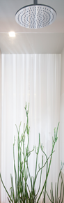 האלמנט הבולט בחלוקה מחדש של הדירה הוא קיר עבה של ארונות, שחוצה אותה לשניים. מצדו האחד חלל "ציבורי" פתוח, שתופס 60% משטחה ובו מטבח, פינת אוכל, סלון ומרפסת פתוחה. הכניסה לחדר השינה היא מעין מבואה קטנה, שמובילה גם לחדר הרחצה. הקיר ביניהם עשוי זכוכית (חלקו מונח על אמבטיית הקוריאן וחלקו תוחם את המקלחון) ויוצר אשליה כאילו זהו חלל אחד, גדול ומפנק. כשרוצים, וילון הסטה לבן מספק פרטיות. המיטה הזוגית המרופדת נשענת אל קיר לבנים חשוף, שמוסגר בתאורת לד נסתרת.